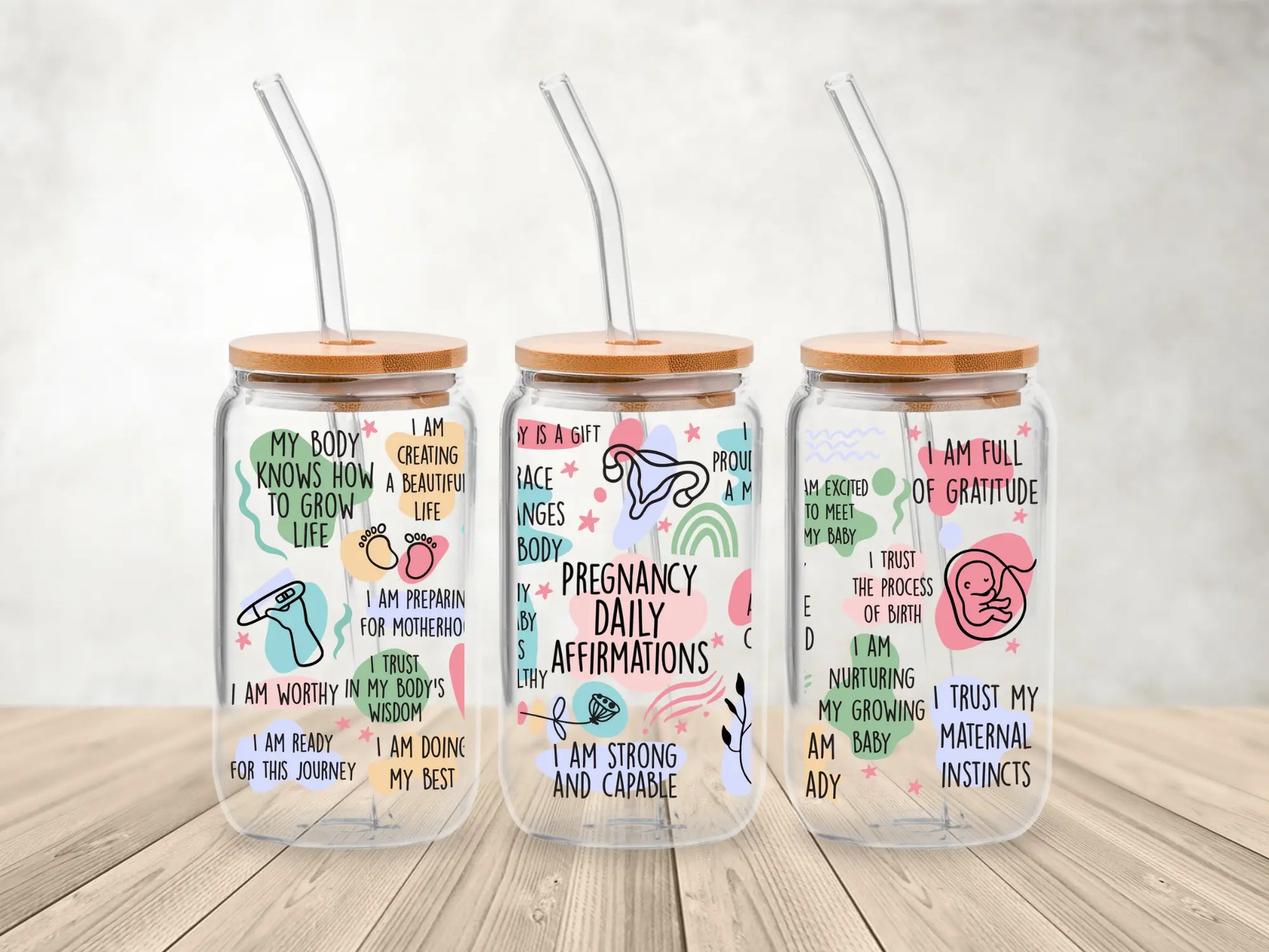Stay hydrated and empowered with every sip! This 473ml (16oz) glass can tumbler features Pregnancy Daily Affirmations wrapped around the cup—perfect for mums-to-be who need a little daily encouragement. Complete with a bamboo lid, glass straw, and straw cleaner, it's ideal for water, smoothies, or herbal teas to keep you and baby nourished.