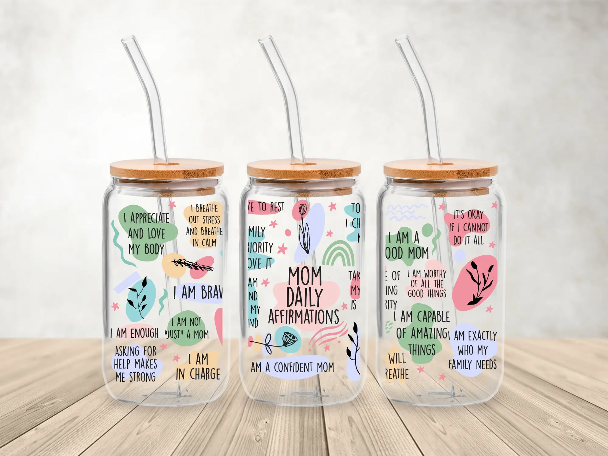 Daily Mum Affirmations – 473ml (16oz) Glass Can Tumbler with Bamboo Lid & Straw