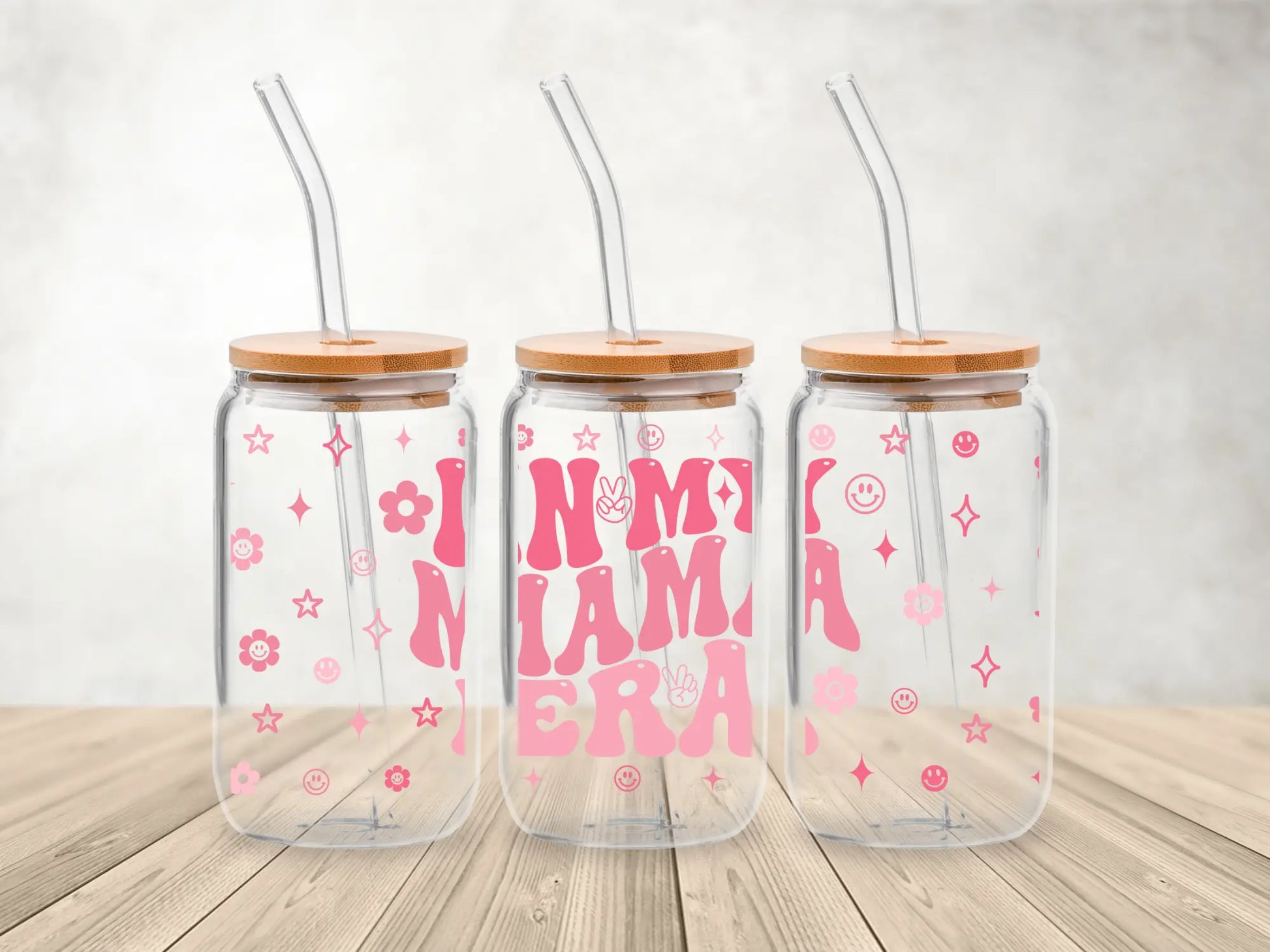 In My Mama Era – 473ml (16oz) Glass Can Tumbler with Bamboo Lid & Straw